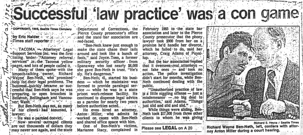 But Ben-Neth was not, as many of his clients had assumed, a lawyer. He was a paroled convict. Now several outraged clients are out thousands of dollars they may never see again, and the state Department of Corrections, the Pierce County prosecutor’s office and the state bar association are red-faced.
